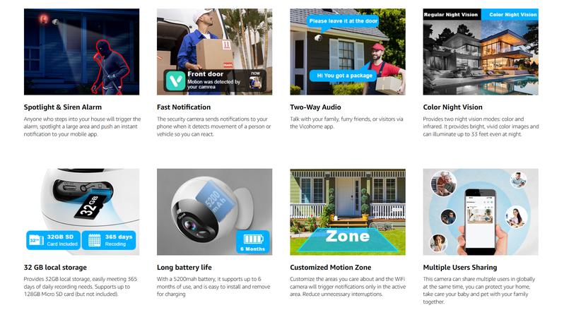- [Cloud/32G SD Storage for Data Secure] Our WIFI Cam is packed with a 32GB SD card local storage to enjoy up to 6000 footage, easily cope with one year of use. Accessed with the Vicohome App, it provides free rolling 3-day cycle cloud storage, and you can enjoy storage service without a subscription. It provides a 30-day free trial of advanced features that include AI recognition, upgraded cloud memory, custom alert areas etc, the advanced features start at $2.99 per month after a 30-day free trial.