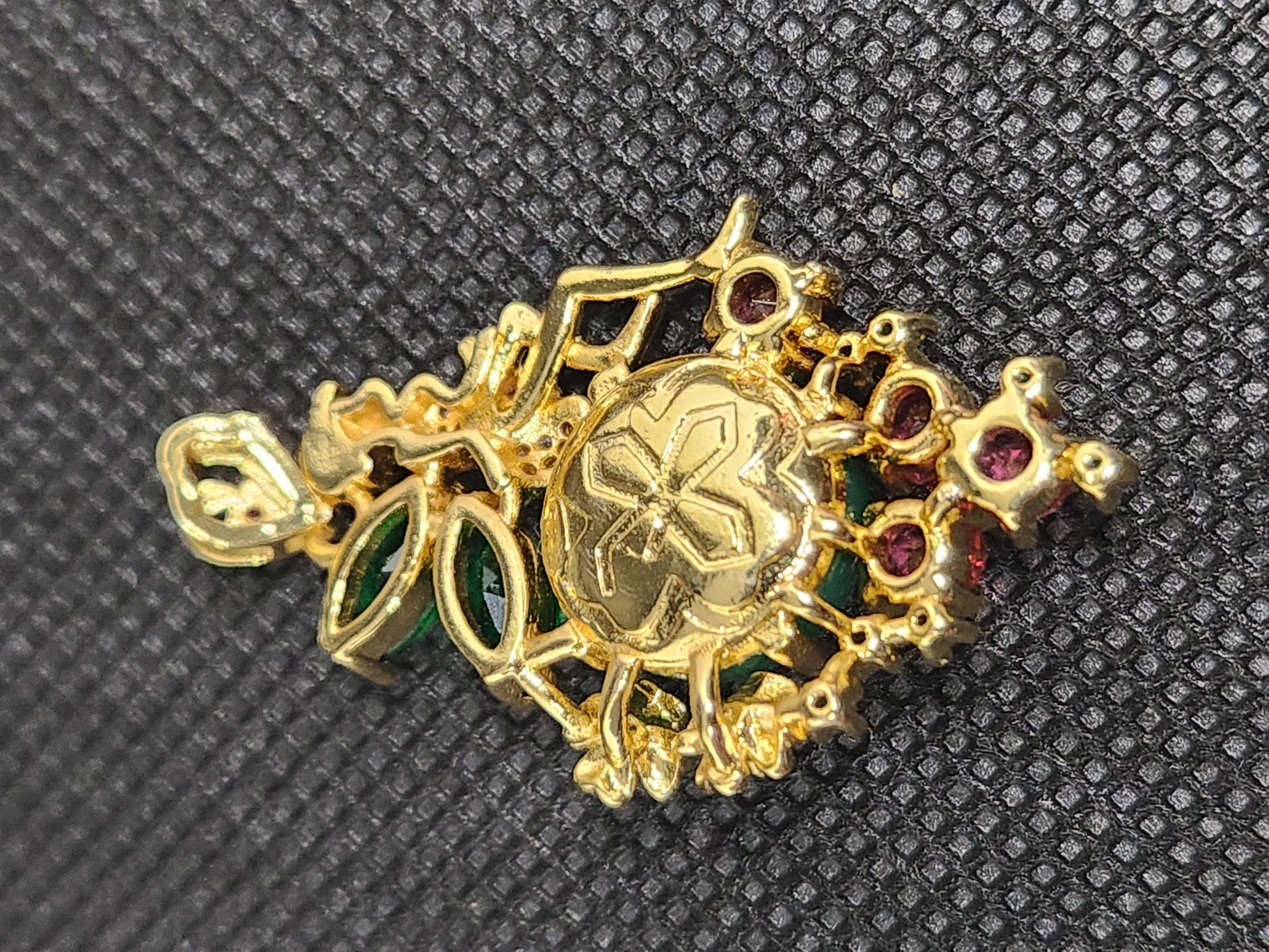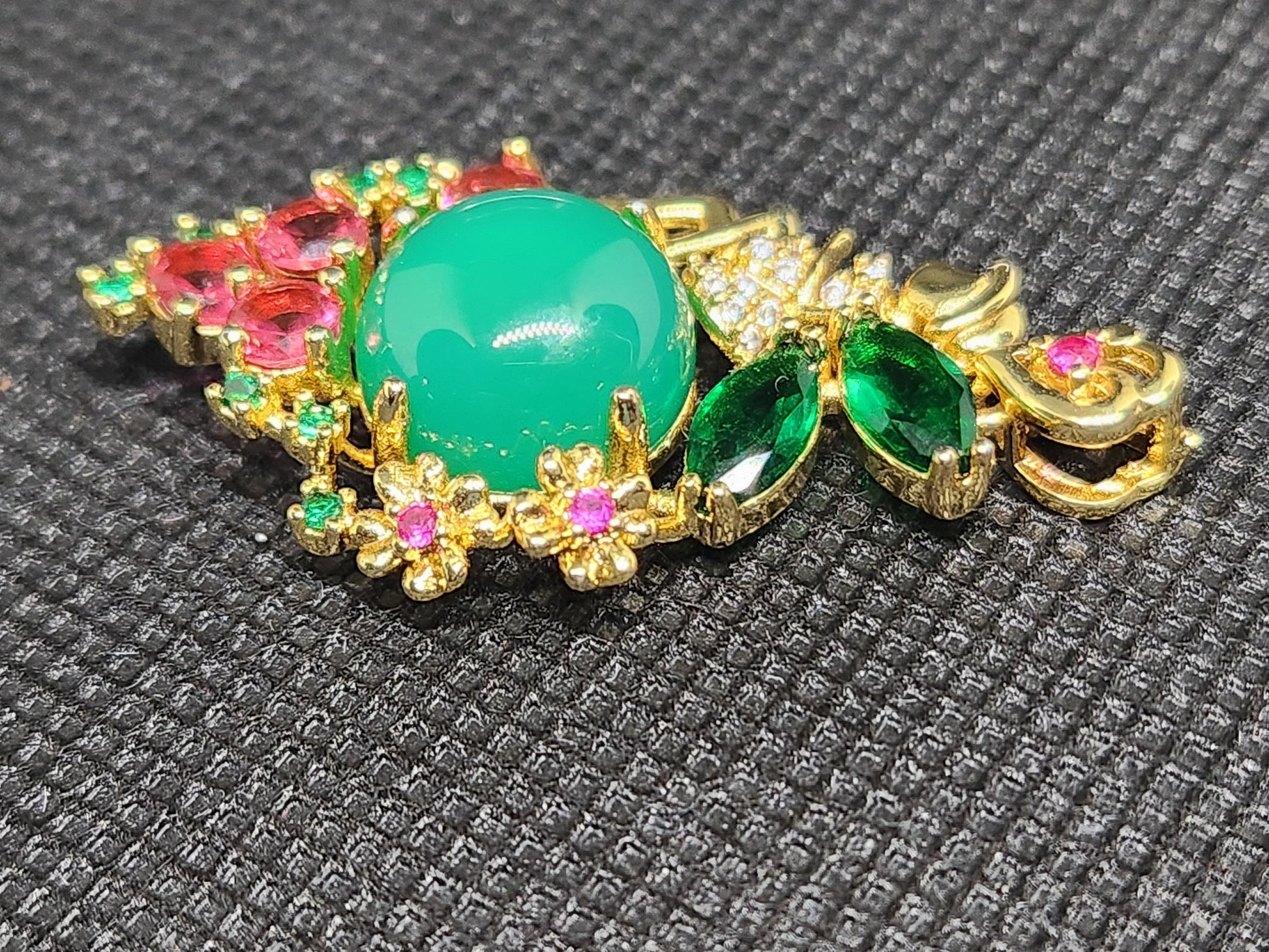 Surrounding the jade are intricately crafted flower designs, adding a touch of natural beauty and sophistication to the piece. The 24k gold plating enhances its luxurious appeal and ensures lasting shine.