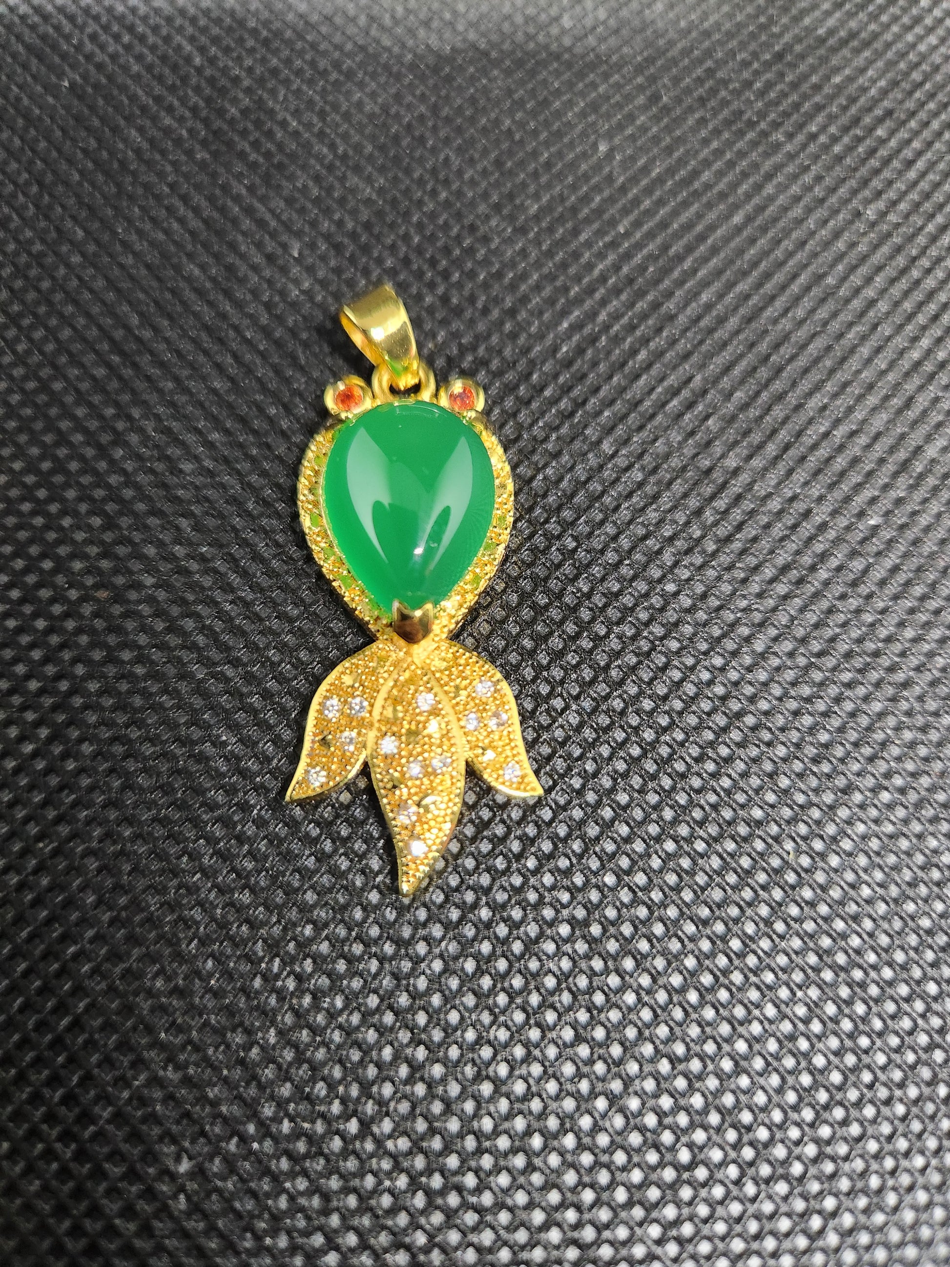 Gold Fish with Green Ice Jade Pendant, 24k Gold Plated