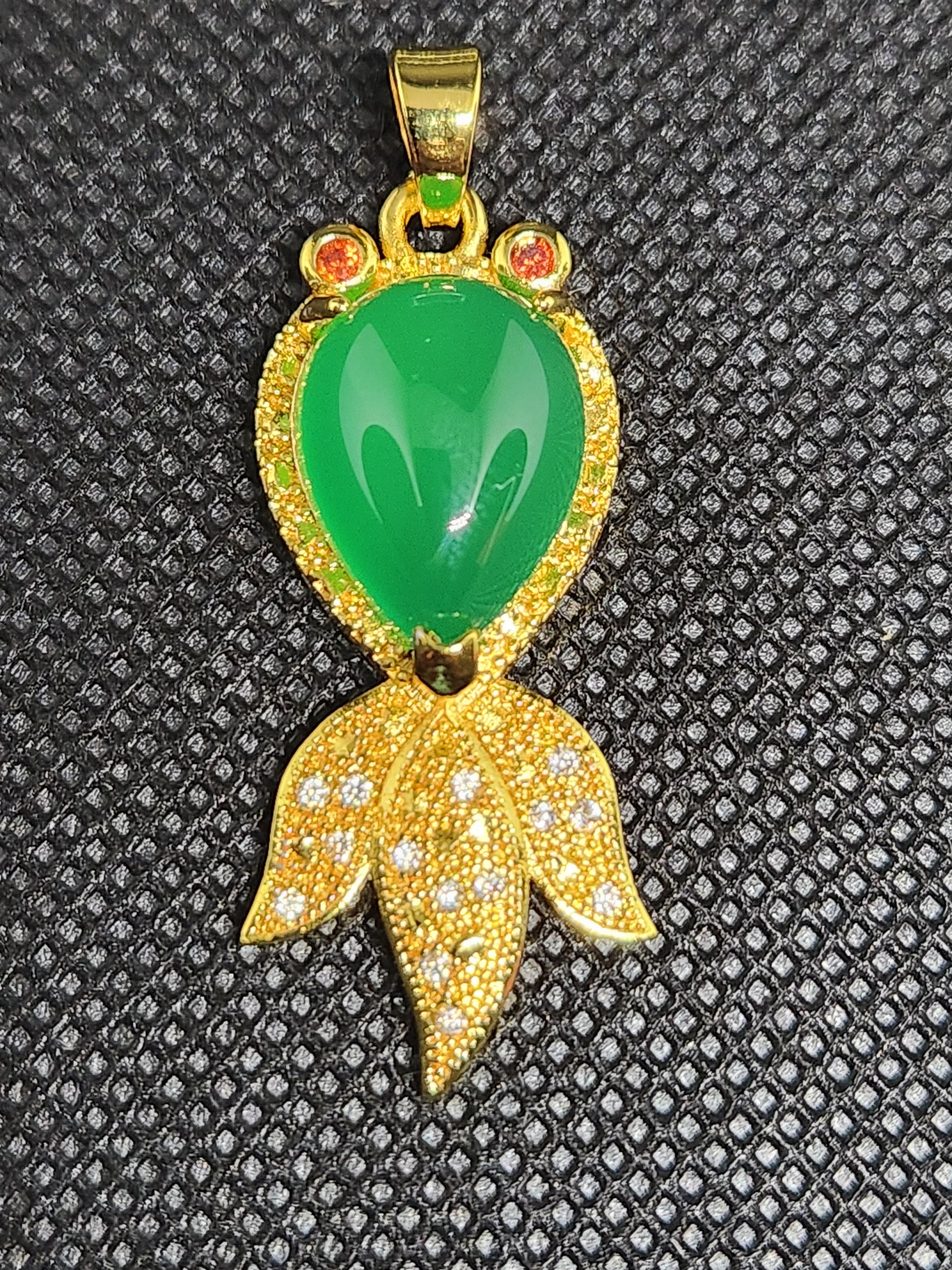 Dive into elegance with our Gold Fish Pendant adorned with a Green Ice Jade centerpiece, delicately plated in 24k gold. This pendant features a charming gold fish design crafted to accentuate the natural beauty of the translucent green jade.