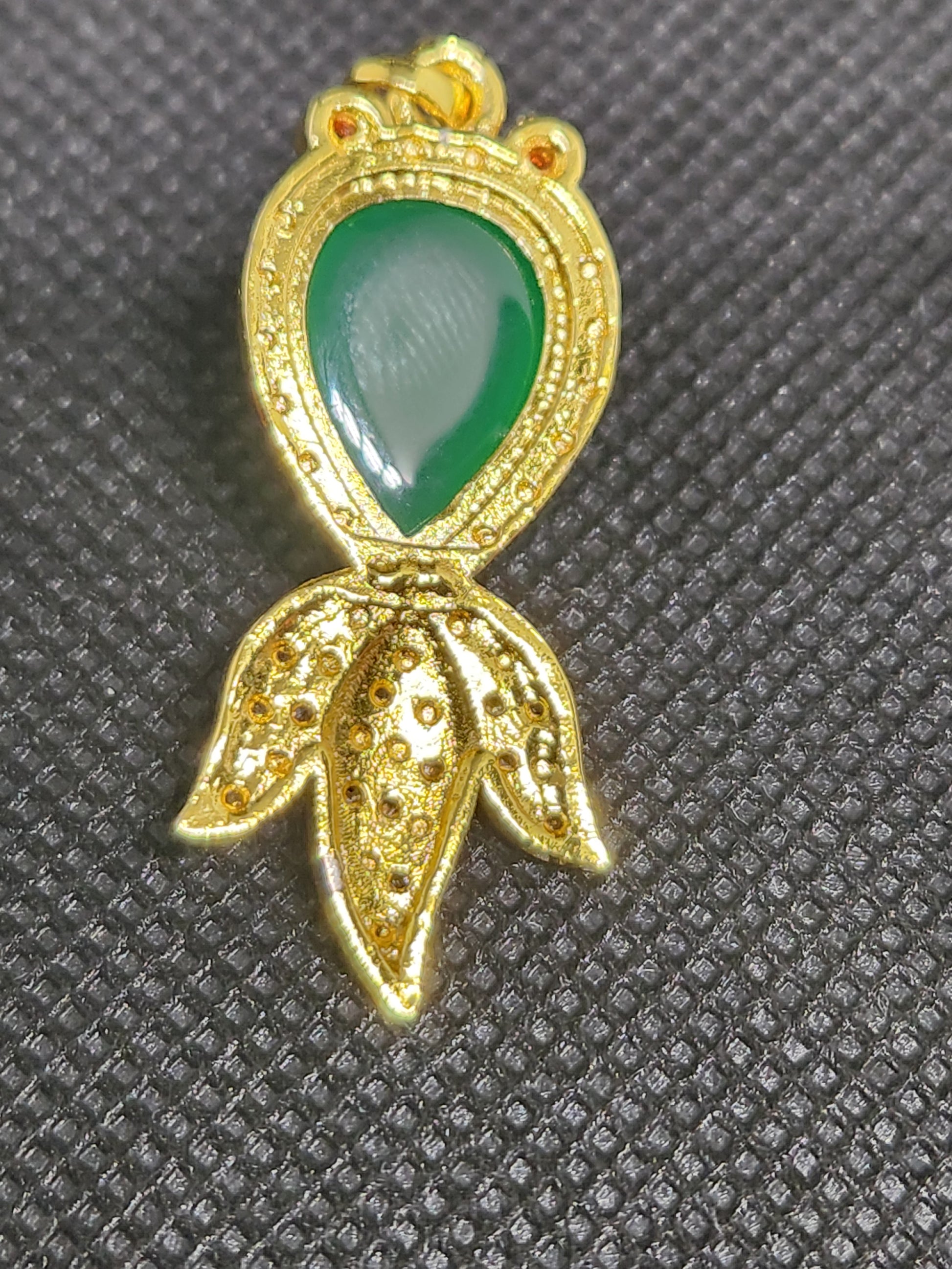 The Green Ice Jade, known for its soothing energy and exquisite color, is meticulously carved to highlight its smooth texture and unique patterns. The 24k gold plating adds a touch of luxury and durability to this captivating piece.
